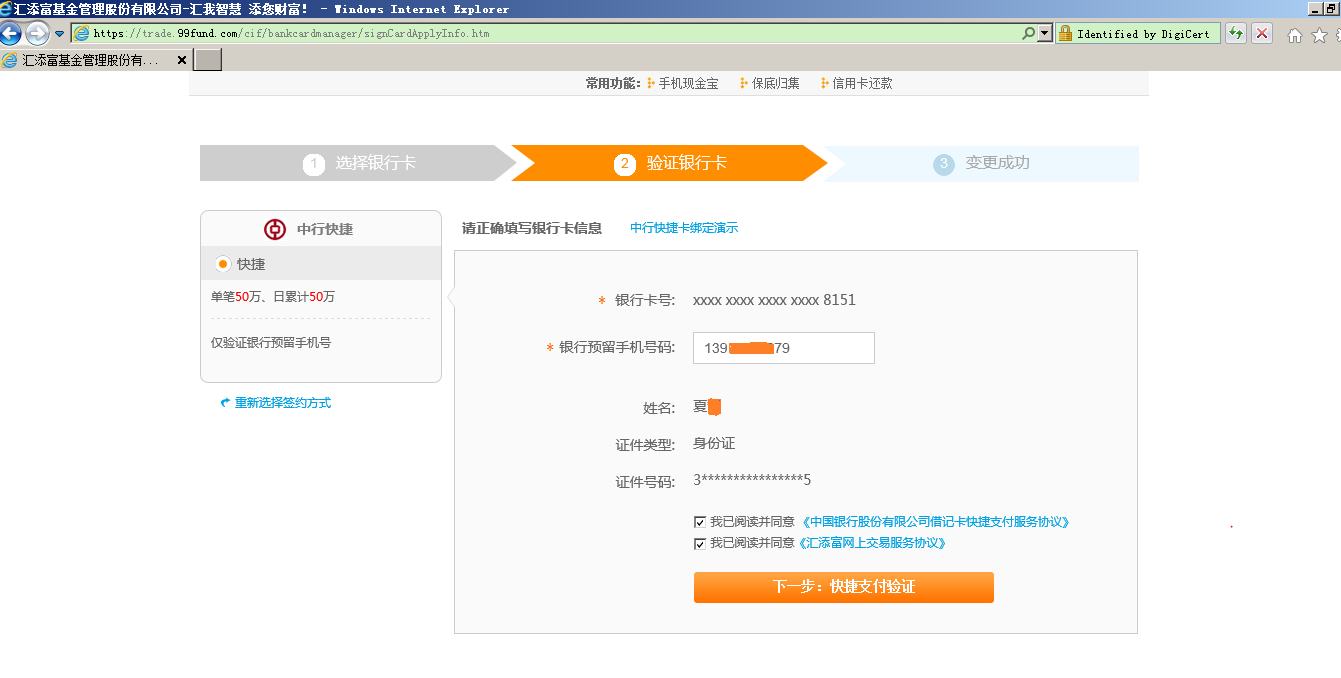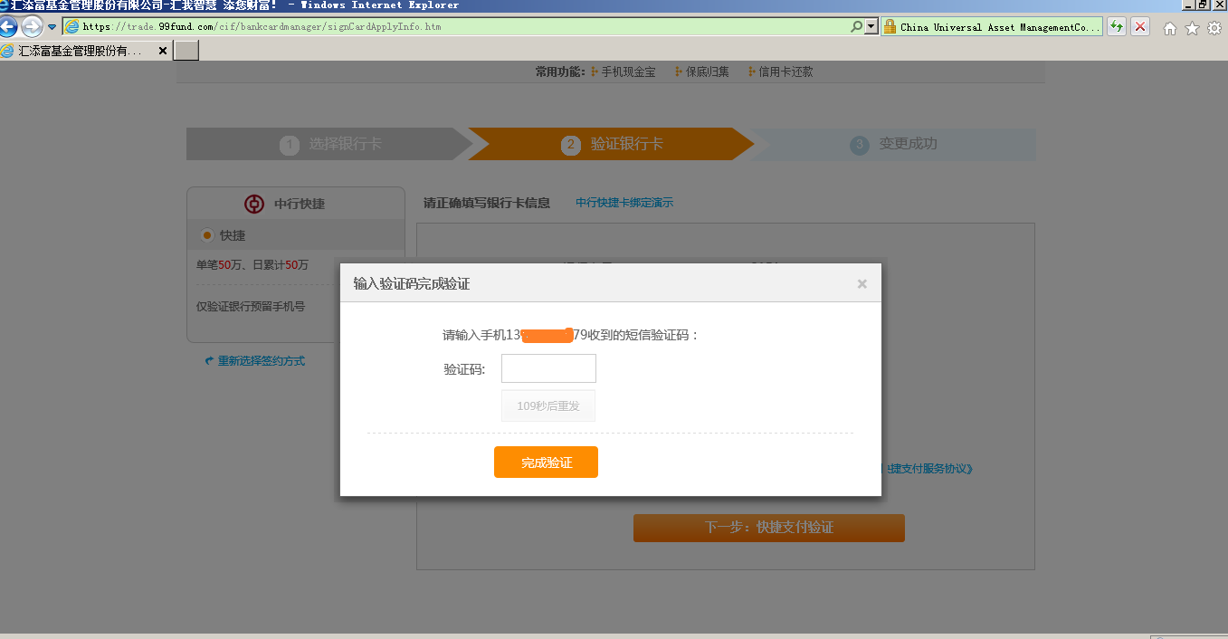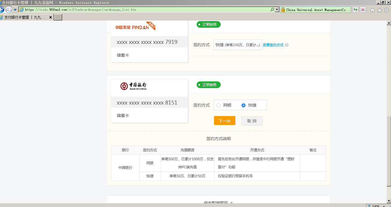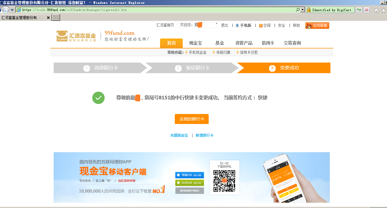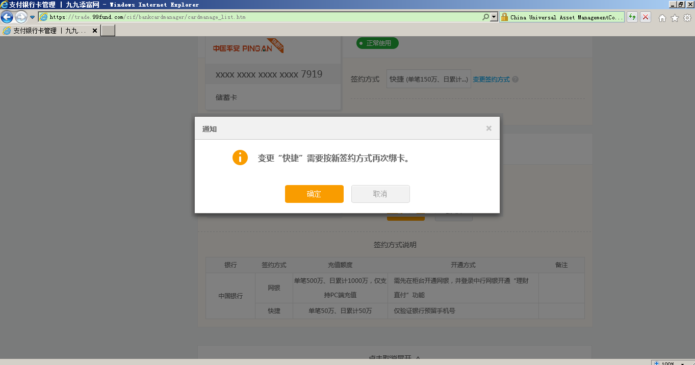 第一步 (App不支持操作)通過匯添富官網(wǎng)(www.m.yataow.com)網(wǎng)頁登錄現(xiàn)金寶賬戶,點(diǎn)擊“首頁”-“銀行卡管理”,點(diǎn)擊“變更簽約方式” ,選擇“快捷”模式