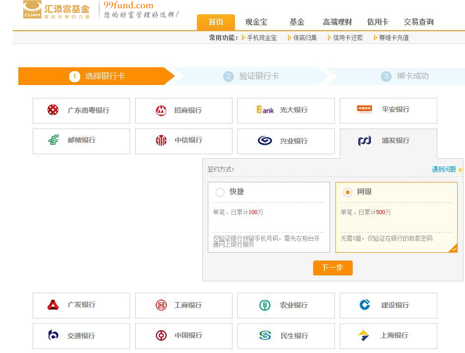 第二步 選擇浦發(fā)銀行卡,點(diǎn)擊下一步