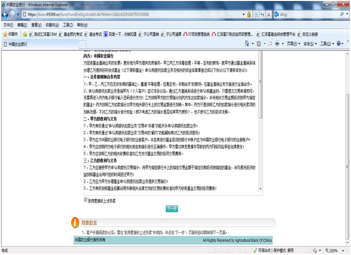 3.2 輸入K寶密碼后,頁面跳轉(zhuǎn)至在線簽約頁面,勾選《中國(guó)農(nóng)業(yè)銀行基金網(wǎng)上直銷申認(rèn)購?fù)惺杖絽f(xié)議》,點(diǎn)擊“下一步”;