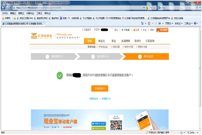 3.6 在“您選擇的網(wǎng)頁正試圖關(guān)閉”的窗口中,選擇“是”,跳轉(zhuǎn)到匯添富網(wǎng)頁,提示綁卡成功。