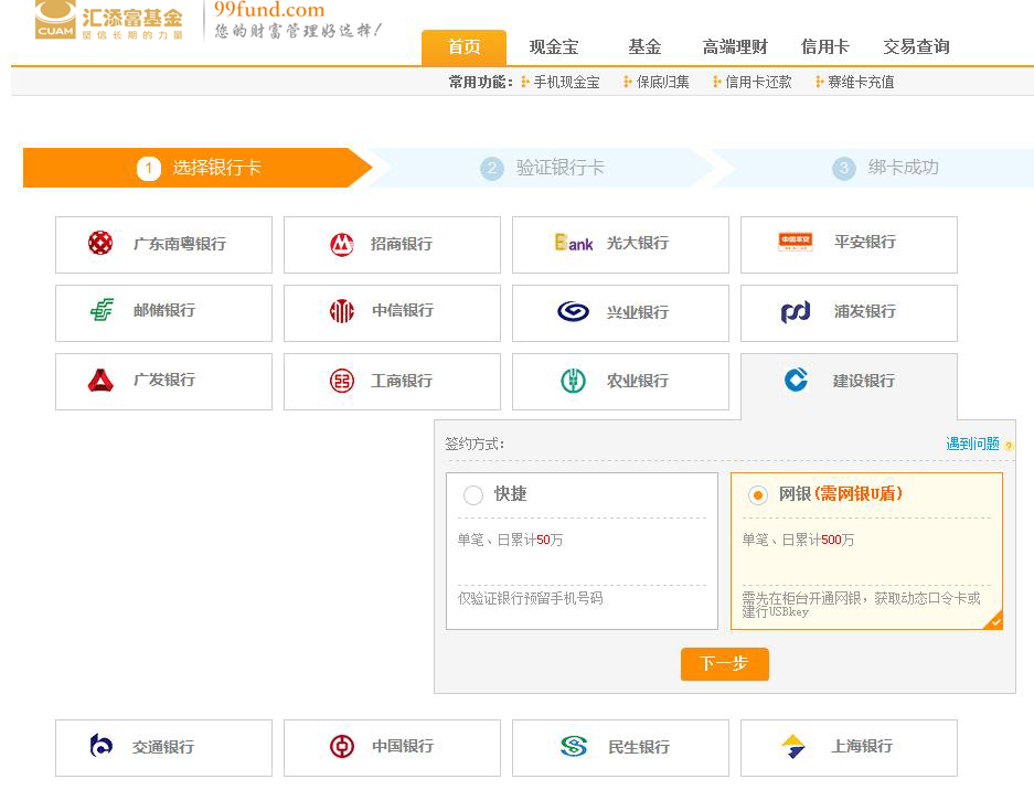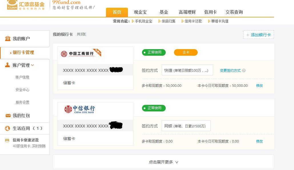 第一步 登陸匯添富官網(wǎng)網(wǎng)頁賬戶,點擊“首頁”-“銀行卡管理”,選擇“添加銀行卡”