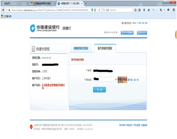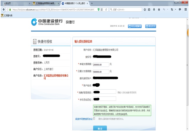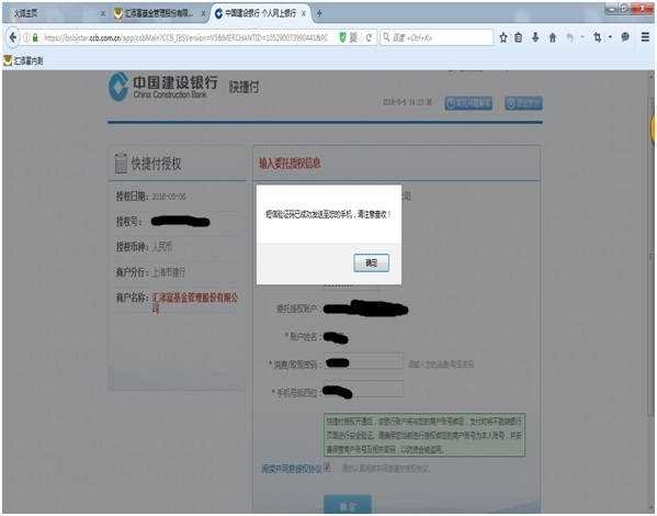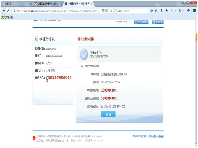 3.7 建行網(wǎng)銀快捷付授權(quán)成功,點擊"關閉"后,返回匯添富網(wǎng)上交易系統(tǒng)注冊頁面;