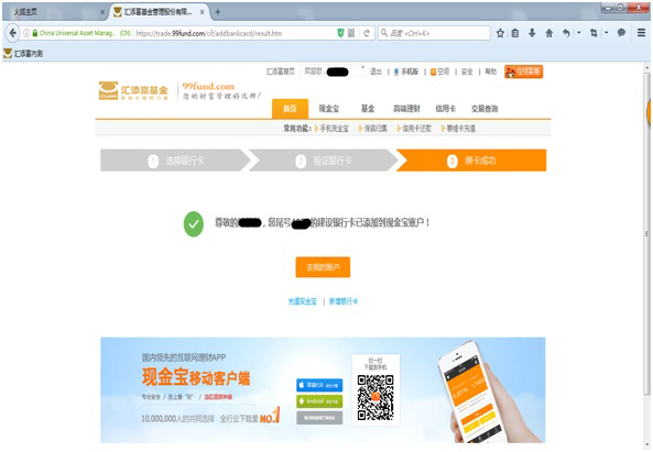 3.8 回到匯添富網(wǎng)站頁面。提示綁卡成功。