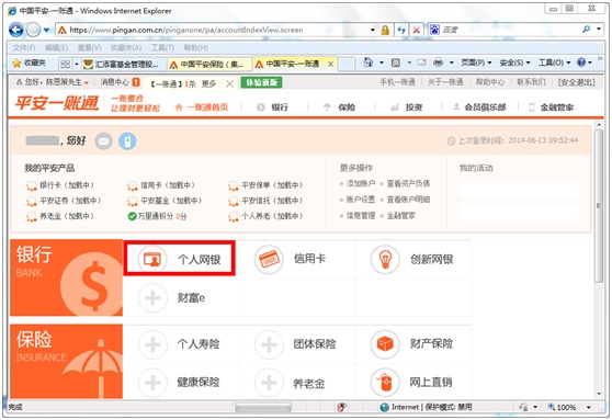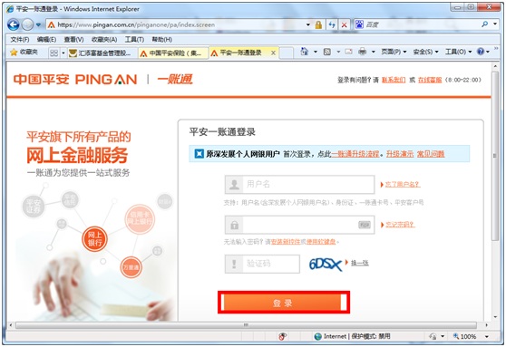 2.       輸入平安一賬通的用戶名、密碼、驗(yàn)證碼后點(diǎn)擊“登錄”按鈕