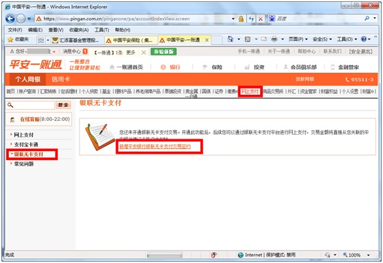 4.       在個(gè)人網(wǎng)銀頁(yè)面,點(diǎn)擊“網(wǎng)上支付”-“銀聯(lián)無(wú)卡支付”,點(diǎn)擊“新增平安銀行銀聯(lián)無(wú)卡支付交易簽約”