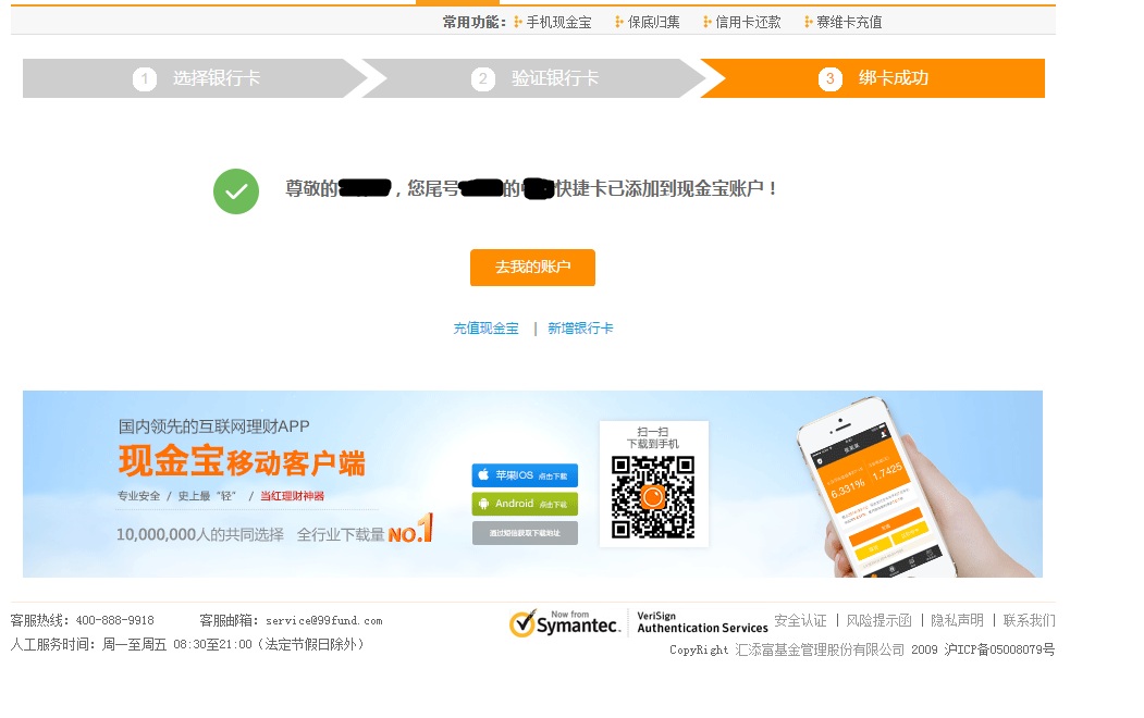5、銀行卡添加成功,可以充值現(xiàn)金寶或購買基金、理財產(chǎn)品等。