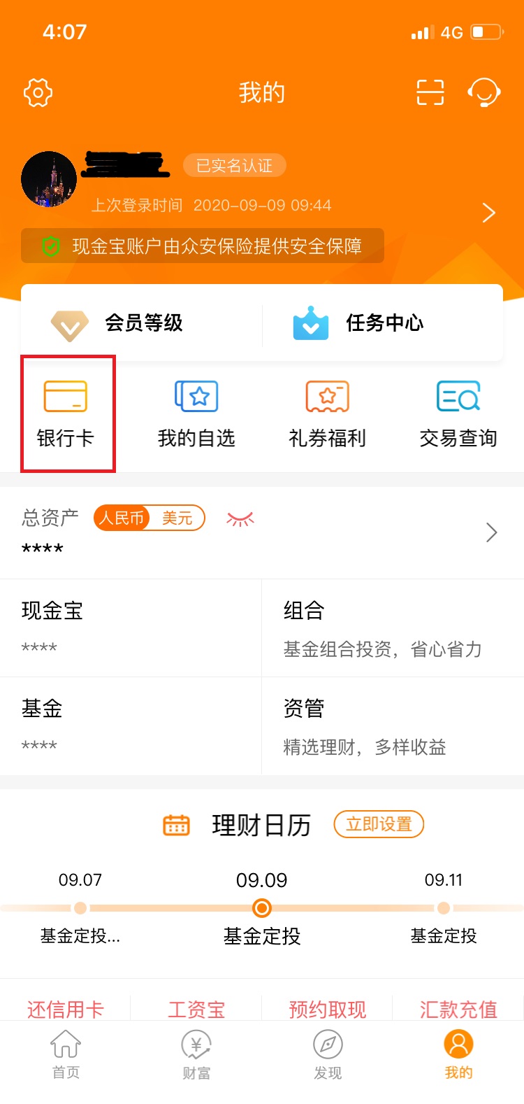 1、登陸現(xiàn)金寶手機(jī)APP,在首頁(yè)點(diǎn)擊“我的”—“銀行卡”。